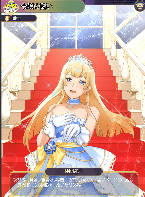 仲間能力 攻撃後に発動、自身は6秒間:攻撃力+455%、