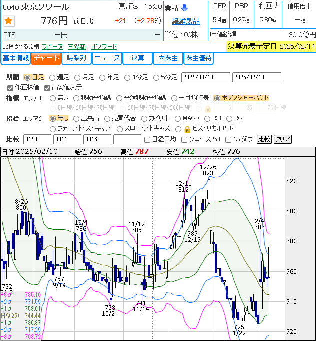 | 東京ソワール | 8040 | 2676 | 8% | 45.0円 | 1.5844544096 | 776 | 1065 | 37% |