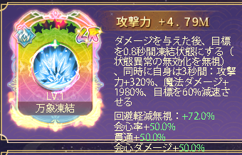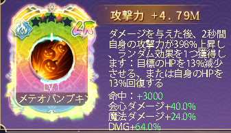 スキル効果 ダメージを与えた後、自身は6秒間、ランダムに以下のいずれか1つの効果を獲得する:攻撃力+218%、会心ダメージ+468%、ダメージ加算+362%