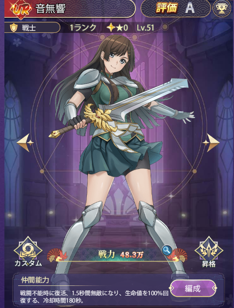 戦闘不能時に復活 1.5秒間無敵になり。生命値を100%回復する、冷却時間180秒