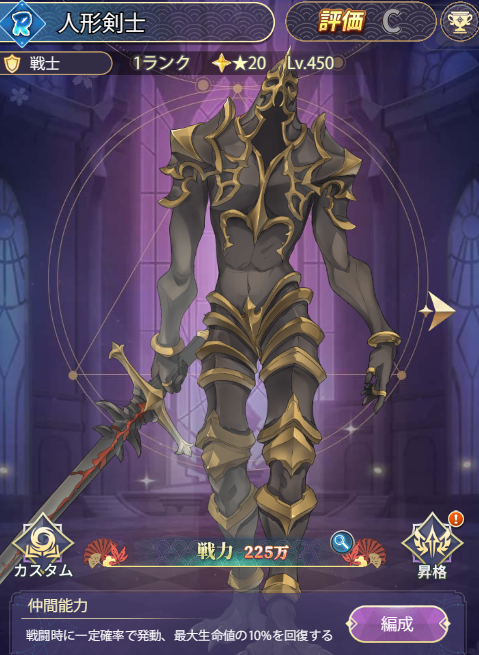 戦闘時に一定の確率で発動、最大生命値の10%を回復する