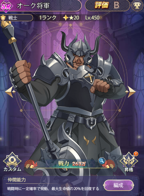 戦闘時に一定確率で発動、最大生命力の20%を回復する。